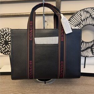Elegant Coach Tote bag with black leather. Features signature logo straps. Ideal for business or casual use.