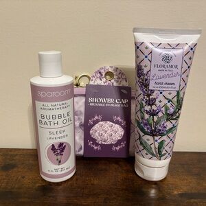 Indulge in a relaxing bath experience with 's Lavender Bubble Bath Oil and Floramor's Lavender Hand Cream. The soothing lavender scent provides a calming effect, perfect for unwinding after a long day. The set includes a shower cap for added convenience.