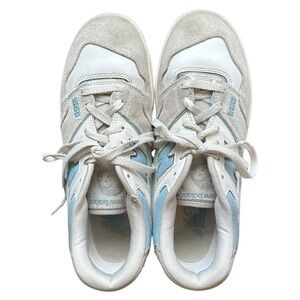 These New Balance 550 Sneakers in University Blue/Gray/Gum are a Men’s 8.5/Women’s 10 (Style Code BB550FCB). In overall good condition, with some wear from prior use. See photo 5 and 8 for small tear at the collar. Priced accordingly!
