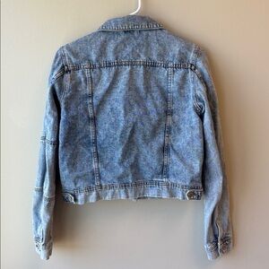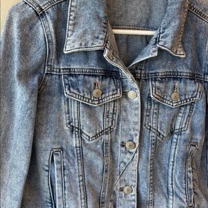 Chic denim jacket with button front. Features classic collar and chest pockets. Ideal for layering.