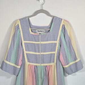 Vintage Saybury Multicolor Seersucker Housecoat. Size Small. Front Zipper 3/4 Sleeves; Side Pockets; 1980's. Measurements Pit To Pit 19 1/2 Inches; Length 40 1/2 Inches.
