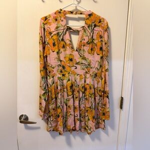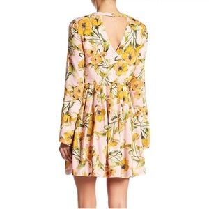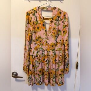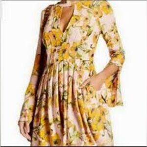 This pretty dress by Free People features an all over floral print with pleated details, Front and back keyhole details which creates a choker like neckline, Long bell sleeves with splits at the cuffs, Hidden side zipper closure and back button closure, Side seam pockets, Lined bodice, 100% Rayon