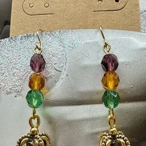 Mardi Gras colored beads & Gold Crown Drop Earrings handcrafted 2/$22