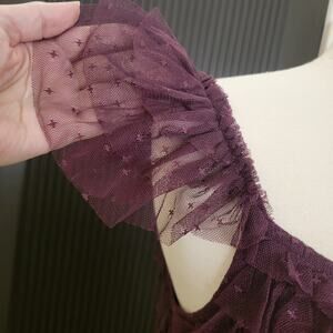 romantic ruffle gown, purple tiered dress, feminine midi gown, textured mesh dress, wedding guest style, soft romance eveningwear