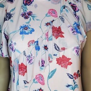 An asymmetrical design featuring a high-low hem, ruffle across chest, raw edges and flutter sleeve on one side. A-line style with high neckline.