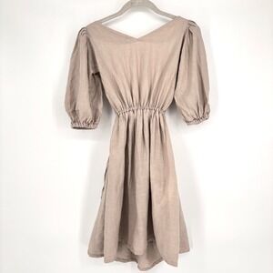 Mie Mini Gozo Dress Sz S Beige Linen Puff Sleeve Strappy Open Back Minimalist