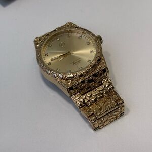 Elegant gold watch with a textured band. Features crystal accents on the dial. Barely worn, about two links taken from watch band, I do not have the extra links. This watch is even more stunning in person. Just for a reference, I have a very slim wrist so keep that in mind before purchasing. This is actually a unisex watch, can be for a woman or man, depends on your preference.