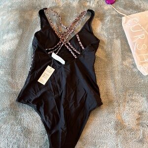 Brand new swimsuit from Cupshe! Black with cute printed straps and body details. Never worn. Hygenic liner still attached. Stretchy fabric.