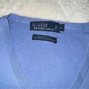 Elegant V-neck sweater by Ralph Lauren. Light blue color. Perfect for layering or standalone wear. Soft and comfortable fabric.