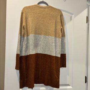 Stay cozy and stylish with this colorblock open front cardigan. Featuring a blend of tan, gray, and brown, this sweater is perfect for layering. Like new. Worn Once