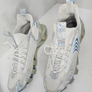 Sold as is. Has a little damage to the tip. See photos. Stylish white sneakers with blue accents. Unique sole design for a modern look.
