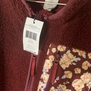 This maroon fleece jacket offers warmth and style with its charming floral pocket. Perfect for keeping your child comfortable on chilly days.