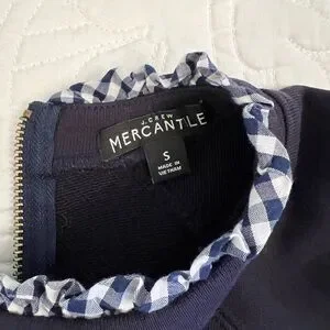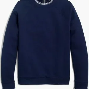 J. Crew navy blue crewneck sweatshirt with pretty gingham ruffle neck detail. Pullover; gold back zip.
