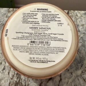Decorative pink candle with a silver lid. Features festive ornament designs. Merry Mimosa scent