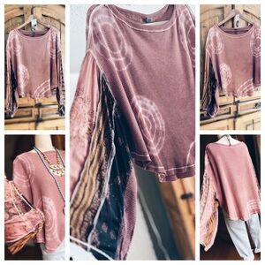 OOAK Another one of my many designed and altered pieces. You can see before and after pics in the photos. Faded rust dip dye body with purposeful faded tie dye and patterned sleeves. Made to look loved and lived in. Bell sleeves in a gorgeous pattern of rust paisleys and medallions. Reverse seam styling . Unique and one of a kind free people makeover. Shades of rust, brown, Carmel, and matte gold and matte rose. MSRP : 200.00 Size S : pit to pit 26” Shoulder to hem is 24”L Bell cuff is 12” W. Top only this listing. Necklaces are listed separately.