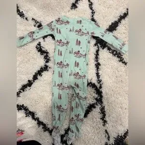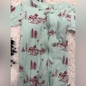 Adorable light green footie pajamas with playful Disney Mickey and Minnie Mouse design. Perfect for bedtime fun.