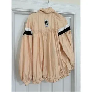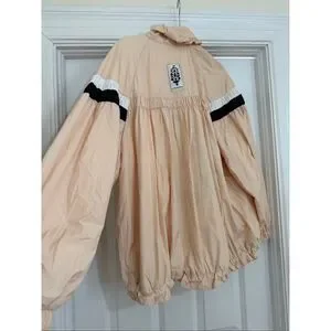Features: Button-front closure; classic collar; ruche detailing; striping at sleeves; printed lining; side pockets; elasticated sleeve cuffs; drawstring bottom hem; water-resistant fabrication