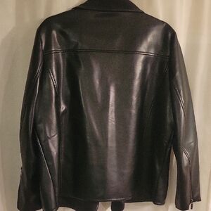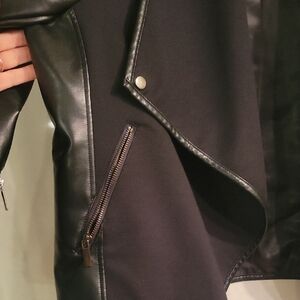 Chic black faux leather jacket by Bagatelle. Features sleek design and open front. Perfect for layering.