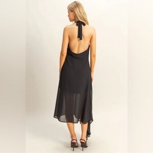 Elegant black halter dress featuring a soft rosette detail and a flowy asymmetrical hemline. This piece has a lightweight, drapey feel that moves beautifully and gives a romantic, elevated look. The halter neckline creates a flattering open-back silhouette, while the asymmetrical hem adds visual interest and drama.