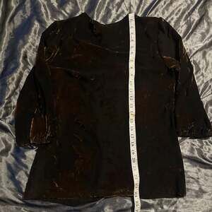 Vintage Carol Rose Brown Burnout Velvet Tunic, Size Medium — Floral Pattern and Ruched Details. This stunning vintage-style blouse features a rich brown burnout floral velvet design on a black base. It has a square/slightly rounded neckline with a ruched, elasticated chest that creates a flattering drape. The sleeves are a 3/4 length, perfect for transition weather. Excellent pre-owned condition with no visible holes, stains, or damage. Measurements are approximately 25 inches in length and 19 inches pit-to-pit. Perfect for a bohemian, Victorian-inspired, or whimsical dark aesthetic.