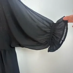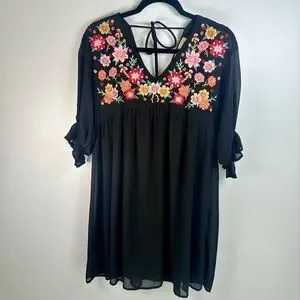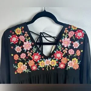 Savanna Jane Black Dress with Pink and Red Floral Embroidery Boho Midi