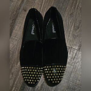 The Amali Spire Spiked Loafers Shoes in size 8.5 are stylish and unique dress shoes perfect for a man looking to make a statement. With a closed toe and slip-on closure, these black loafers feature a distinctive spiked design that adds a touch of edginess to any outfit. Made from durable rubber outsole material and cushioned for comfort, these loafers are a perfect choice for various occasions, from formal events to casual outings. The Amali brand ensures high quality and sophistication, making these shoes a versatile and eye-catching addition to any man's wardrobe.