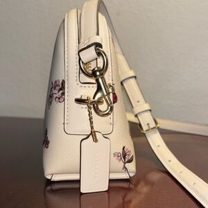 Chic Coach crossbody with floral accents. Perfect for versatile styling. Compact and stylish.