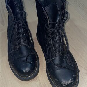 Black combat boots with floral detailing. Iconic and sturdy design.