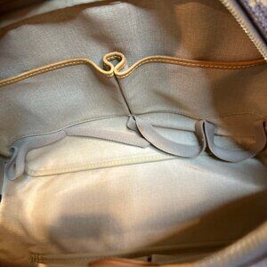 Preowned. Small water marks on exterior vachetta. Rubbing on the handles. Small breaks on exterior leather trim of the pocket. Absolutely amazing bag!!