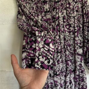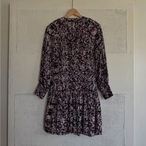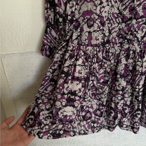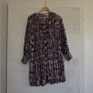 Sea New York Borealis Long-Sleeve Tunic Dress. Easy long sleeve mini dress with intricate purple and black pattern. Button wrists and buttons down the front.