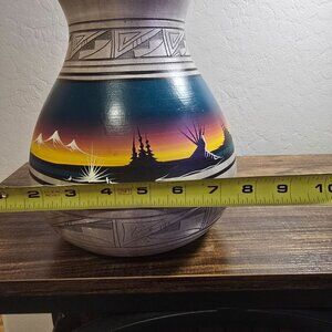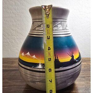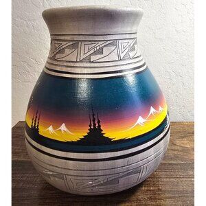 Dineh Navajo Native American Etched Ceramic Vase 9.5x8" Sunset Mountains Signed