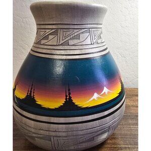This Vintage Evn Stash Dineh hand-painted ceramic vase features a stunning sunset landscape with intricate Native American tribal designs, blending artistry and tradition seamlessly.