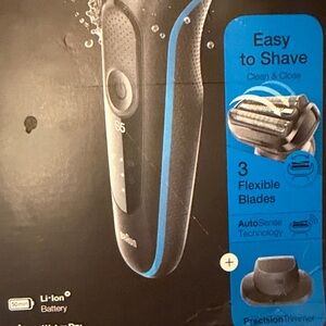 Braun Series 5 electric shaver with ergonomic design. Features a sleek black and blue finish. NEW only box is damaged, all items inside are in tact and only out of original bad for these pics.