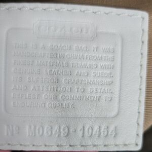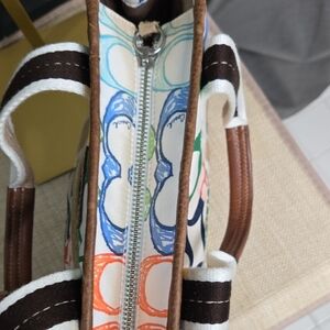 Chic Coach tote with vibrant patchwork design. Features sturdy handles with a 5.5" drop.