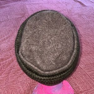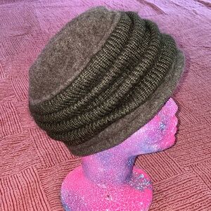 Good used condition, 75% wool 25% acrylic, interior is all wool, exterior is wool on top and bottom and the ribbed detailing is acrylic. Color is a brown with greenish brown rib detail. Inside diameter is 19” I would say fits on the smaller size
