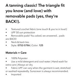 A tanning classic! The triangle fit you know (and love) with removable pads (yes, they're