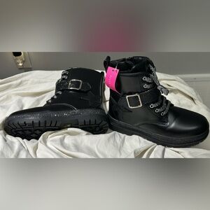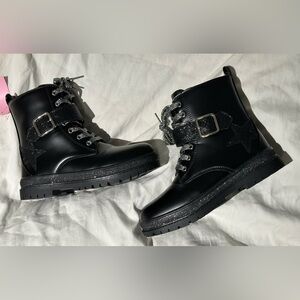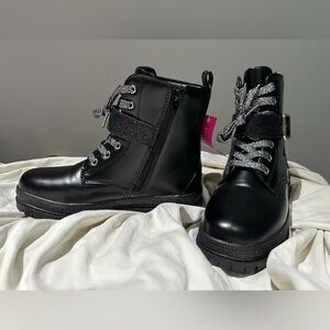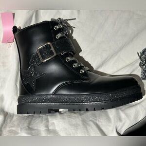 These boots are practically new & the tag is still on! They were worn inside the house for approx 10 minutes before realizing they were the wrong size & then we missed the return window! These are such cute boots with sparkle laces & a star design. There is also a side zipper. The box has some crush damage (last photo) otherwise these boots are in new/excellent condition. Very cute when matched with a skirt & jean jacket outfit 💕 Offers for outfits from my other closet listings are welcome 🙂