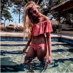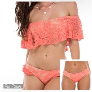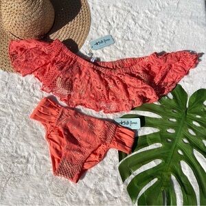 - Amazing bikini with a bright coral crochet color that pops over metallic gold underlay.