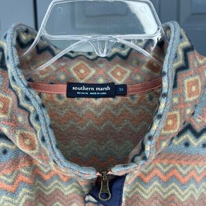 Quarter-zip design with soft, warm fleece and a bold Moroccan-inspired pattern.