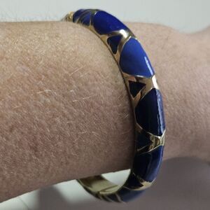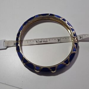 This stunning bracelet is a must-have for any fashion-forward individual. The gold tone bangle features shades of blue enamel, creating a beautiful and eye-catching design. The bracelet is hinged, making it easy to put on and take off, and the enamel material adds a unique texture that is sure to catch the eye.