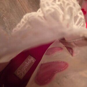 Dollskill pink platform, red heart mesh, frilly lace shoes. By the Brand Sugarbaby (Old name, the name has now changed to Sugarthrillz) Mesh is a little crinkled from storage. In the 4th photo you can see come dirt that has gotten stuck to the mesh with wear. In photo 6 there is slight dents to the heel with storage. Perfect for Valentine's day~♡