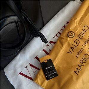 Chic Valentino tote in sleek black leather. Features iconic logo design. Perfect for versatile style. PRICE NEGOTIABLE.