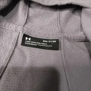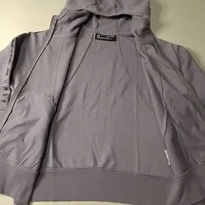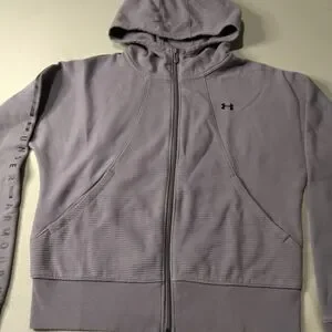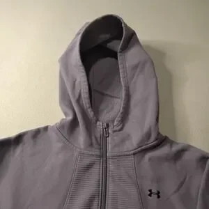 Stylish gray zip-up hoodie by Under Armour. Features a hood and front pockets, preowned.