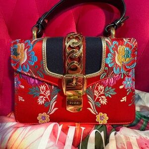 Chic Gucci shoulder bag with vibrant red and blue floral patterns. Perfect for adding a touch of elegance to any outfit.