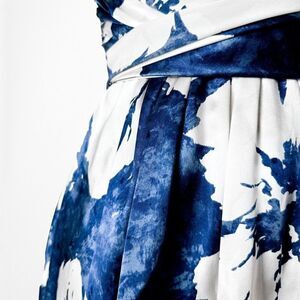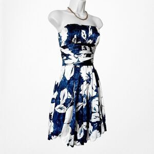 Vintage Y2K Blue White Floral Strapless Pleated Knee Length Silk Dress Size XS
