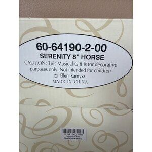Wind-up music box mechanism plays Candle in the Wind. A round metal medallion on the top surface reads “Serenity – Limited Edition” and is individually numbered. Underside labels indicate manufacture by the San Francisco Music Box Company, © Ellen Original box identifies the piece as “Serenity 8" Horse.”