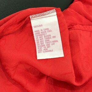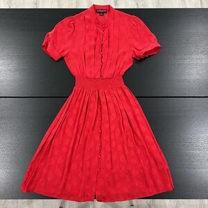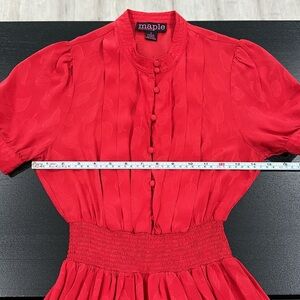 Anthropologie Maple 100% Silk Vintage Style Crimson Red Leaf Print Dress in size 2. Never worn. Very lightweight and flattering. The smocked waist has a ton of stretch. The additional pleats create the perfect fit. Knee length. Pullover styling. Smocked waist. Pleating detail. Button closure at front. Puff sleeves with button closure. High neckline but can be unbuttoned for a different look.