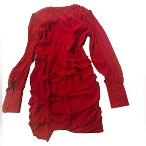 Chic red dress with long sleeves. Perfect for stylish outings. Should pads and under arm side zip. Slight stretch ruched chiffon with button cuffs.
