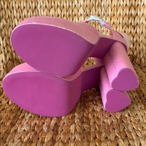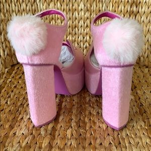 ✨💕✨Fur and fluff!!! Cuteness on overload! The Dollskill collection knocks it out the box! Pink 💕furry platforms with a pink puff tail and red heart at the heel. ⭐️Shape of the heel is also a heart! Little delicate ears at the top of the foot and of course ✨cheer 🐻bear 🎉face at the vamp! Silver ankle buckle. 5” heel with a 2” platform make these easy to wear!!! So cute!!!!✨💕✨