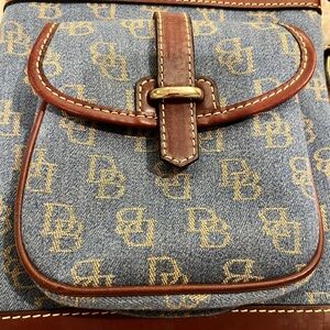 Denim logo crossbody bag with leather trim. Discoloration at trim. Measures 8”x8”x5”